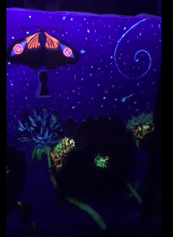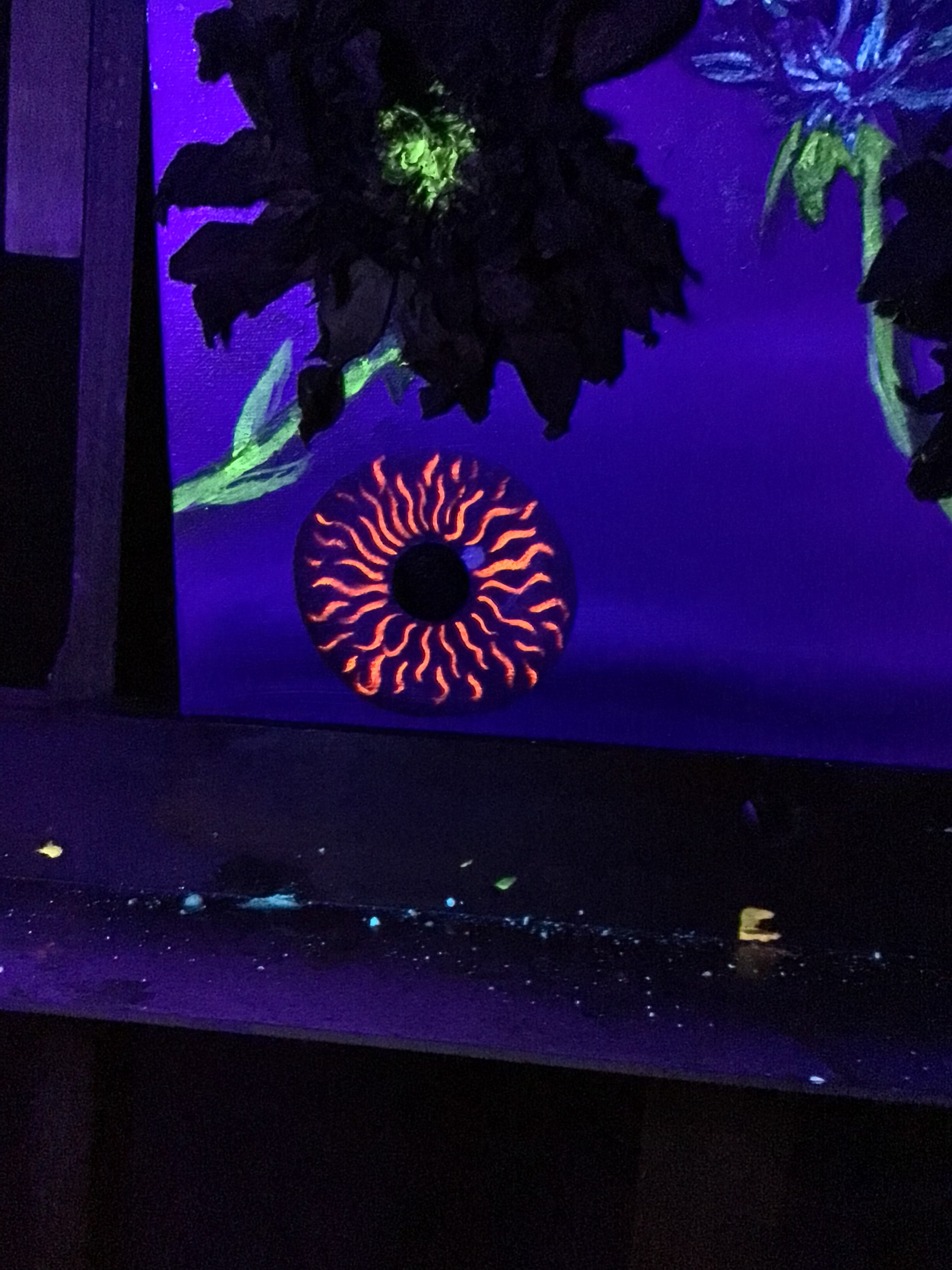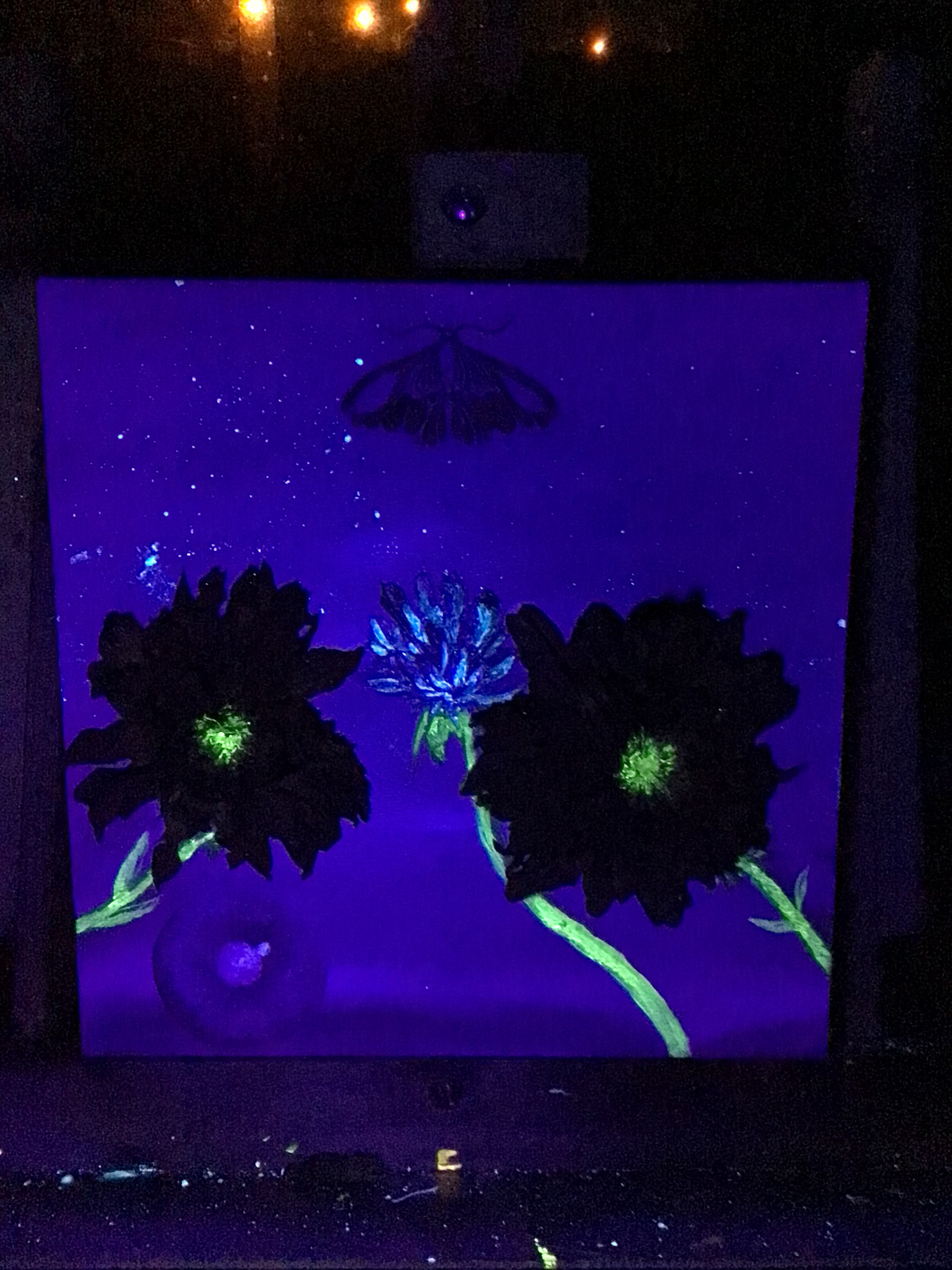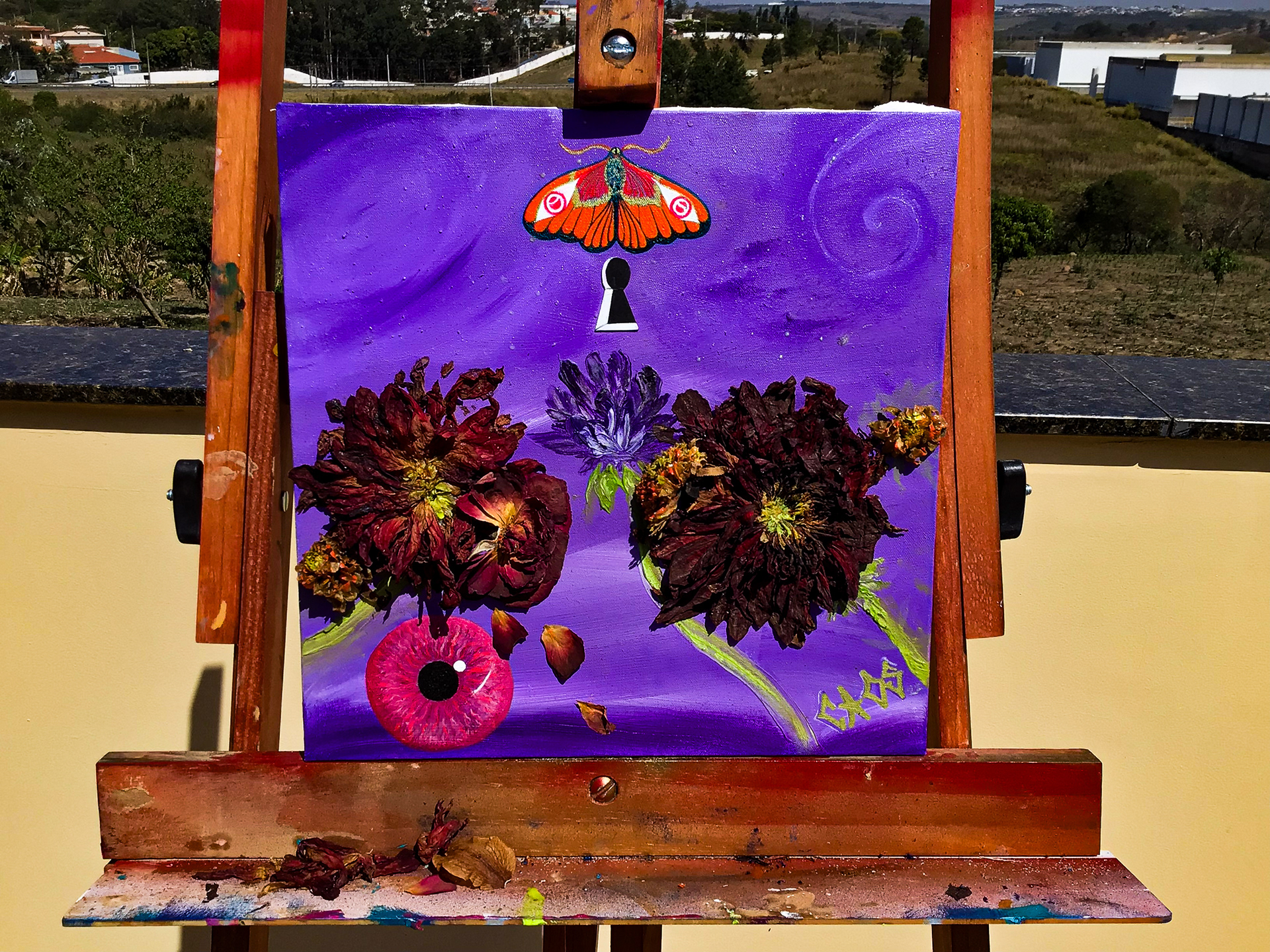 Efêmera II - Sonhos - Óleo sobre tela, pigmento fosforescente, flores Dália seca, aromatizador em spray, 2022. Obra inclusiva para pcd's com interações através dos sentidos, como o olfato, tato e visual.